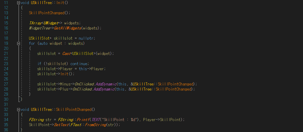 초기화에서는 다른 UI들과 마찬가지로 Player포인터를 대입해주고 해당 UI의 Init함수를 불러줍니다. 그리고 아까 언급한것처럼 SkillSlot이 가지고있는 버튼 두개에 delegate로 SkillPointChanged함수를 연결해줍니다. 해당함수는 버튼이 작동할때마다 UI상에서 남은 SkillPoint를 갱신해서 보여줄 것입니다.